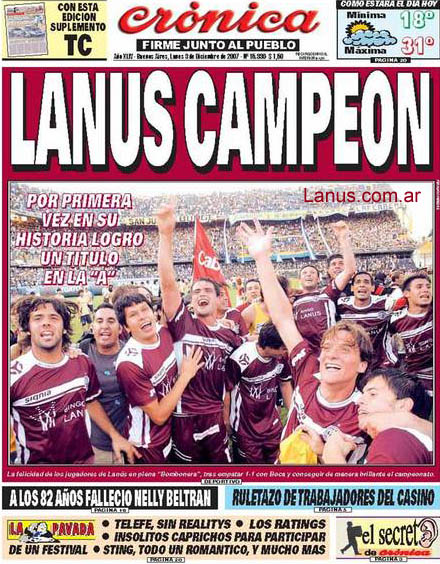 Hasta hace unos días, la canción era:"Este es el año Granate,no le falles a tu gente,la que te sigue alentando,la que siempre está presente.Tenés que salir campeón,tenés que dejar la vida,para que llore el Taladro,los Bosteros y las Gallinas"Y ya está, ya somos CAMPEONES... El sueño de tantos años se alcanzó y hoy los hinchas de Lanús nos sentimos los más importantes del mundo. Merecíamos este título porque ya hace varios años que veníamos arrimando la bocha y siempre nos faltaban cinco para el peso... pero ahora se dio y no va a ser la única vez. Ganar un título era lo que le faltaba a Lanús para sacarse de encima ese peso de no tener una copa nacional en las vitrinas, y ahora va a ser más fácil (hablo psicológicamente) poder lograr más campeonatos. Lo de ayer fue el punto de partida de una época de gloria.Justamente eso es, nada más ni nada menos, lo que los hinchas de Lanús nos merecemos. Porque si bien hubo muchas cosas de las buenas, tuvimos bastantes de las malas (y bien jodidas). En dos años nos fuimos de la "A" a la "C" y el camino de vuelta se hizo muy difícil. El club casi fundido, dirigentes ineptos, jugadores que llegaban al club para robar... Por suerte, una realidad totalmente opuesta a la actual, donde dirigentes honestos y responsables, un cuerpo técnico humilde y muy capaz, y un grupo de jugadores (el 90% nacido en las inferiores del club) de gran calidad conformaron una gran fuerza que nos llevó a la gloria.Podría ponerme a detallar muchos momentos ... y por qué no hacerlo? La felicidad por el logro de este campeonato me da la tranquilidad para poder escribir sin ningún tipo de apuro. En un segundo pasan mil imágenes por mi cabeza: de Los Globetrotters y de Los Albañiles no puedo hablar porque no los ví, pero por supuesto los conozco por mi fanatismo granate y por todo lo que me contó mi viejo. Los relatos sobre la calidad del Nene Guidi, las maravillas de Mandrake Lugo, las atajadas de Piromalli y las paredes de Silva y Acosta provocan envidia por no haber podido vivirlas.Uno de mis primeros recuerdos reales es el del ascenso del '76. Me acuerdo esa tarde, escuchando por radio el rato de Jorge Bulrich, y si no me equivoco, ganándole 2 a 0 a Almirante Brown, con un gol de Epifanio. A partir de ahí ya tengo en mi cabeza imágenes vividas: el debut contra All Boys, bajo una torrencial lluvia y con un 4-0 a favor, el empate 1 a 1 en cancha de Independiente, el 1 a 1 con River en cancha de Huracán (con gol de Lorenzo Ojeda de penal), el triunfo sobre Boca por 2 a 0 (con Perassi atajando para ellos), el último partido del año, como local, ante Rosario Central que se mató para ganarnos y mandarnos a jugar un desempate por el descenso con Platense... y cómo olvidar esa noche en el Viejo Gasómetro de Av. La Plata!!! Si cierro los ojos un instante puedo ver claramente el cabezazo del Negro Zárate, casi sobre la hora, que reventó el travesaño y nos hubiera dejado en Primera. Después, la interminable serie de penales y la historia bien conocida.Ahí entramos en un tobogán peligroso que nos llevó, sin escalas, a la Primera C. No fue sólo una debacle futbolística sino, principalmente, institucional. El debut en cancha de Barracas Central fue 1 a 1, con un gol de penal (y con fortuna) de Marcelo Fuentes, sobre la hora.La vuelta a la B, que imaginábamos inmediata, duró tres largos años en los que enfrentamos a equipos que, sin desmerecerlos, hoy están años luz de lo que es nuestra realidad... Si hasta jugamos contra Piraña que hoy muchos ni recuerdan que existió!!La llegada de Don Juan Manuel Guerra nos terminó de encarrilar y (¡como ahora!) los pibes del Club (Nigretti, Crespín, los hermanos Enrique, Sicher, Attadía, el eterno Mago Lodico, etc.) nos dieron el campeonato. Me aparece en la mente, como punto máximo, el gol de Nigretti contra Chacarita, que hizo que nos despeguemos en la punta. Pero me resulta inolvidable el gol de Sicher, casi desde el córner, la tarde del 8 a 0 a Gral. Lamadrid.Volvimos a la B y ese año había que enfrentar al fenómeno San Lorenzo. De visitantes empatamos 0 a 0 en cancha de River (un par de días después del inicio de la guerra de Malvinas) y de local les ganamos 1 a 0 con gol de Ramón Enrique bajo una persistente lluvia.Todos los años renovábamos la esperanza de volver a Primera, pero siempre moríamos en el intento. Era la época de Perassi, Demagistris, el Tano Labonia. En 1986 se creó el Nacional B y ahí entramos con lo justo, ganando el último partido 5 a 1 a Alte. Brown. El debut en la nueva categoría fue en nuestra cancha, la de los tablones que tantas tardes resistieron los saltos de la hinchada, con un 3-0 sobre Gimnasia de Jujuy (un gol de Saturno al minuto).Aparecieron Leo Rodríguez, el Pipi Váttimos, Juan Carlos Ramirez, llegaron el gran Gilmar Gilberto Villagrán (¿no se le podría poner su nombre al estadio?), el Potro Echaniz, pero no podíamos lograr el objetivo de campeonar.Para la temporada 1988/89 llegó Roberto Rogel y se armó un equipo que fue sensación con el fútbol de Guillermo Alonso y los goles de Gustavo Zalazar. Nos sentíamos campeones desde el mismo inicio del torneo. Faltaban 9 fechas y llevábamos 7 puntos de ventaja (cuando todavía se sumaban 2 unidades por victoria). Imposible no lograr el objetivo... pero el equipo decayó (inolvidable la derrota como local con un equipo de Necochea -del que sí me olvidé el nombre- en el que jugaban el Patón Mainardi y su hermano) y llegó el fatídico 27 de mayo de 1989 (fecha marcada a fuego en mi vida: el mismo día en que yo cumplía 20 años mi amado Lanús se jugaba el ansiado ascenso). Jugábamos de visitante ante Chaco For Ever, al que superábamos en la tabla por un único punto. El empate nos consagraba, pero perdimos 1 a 0, por un gol de Di Marco de penal (al año siguiente fui a Avellaneda a ver Independiente-Chaco For Ever para, expresamente, putear a Di Marco los 90 minutos). El destino